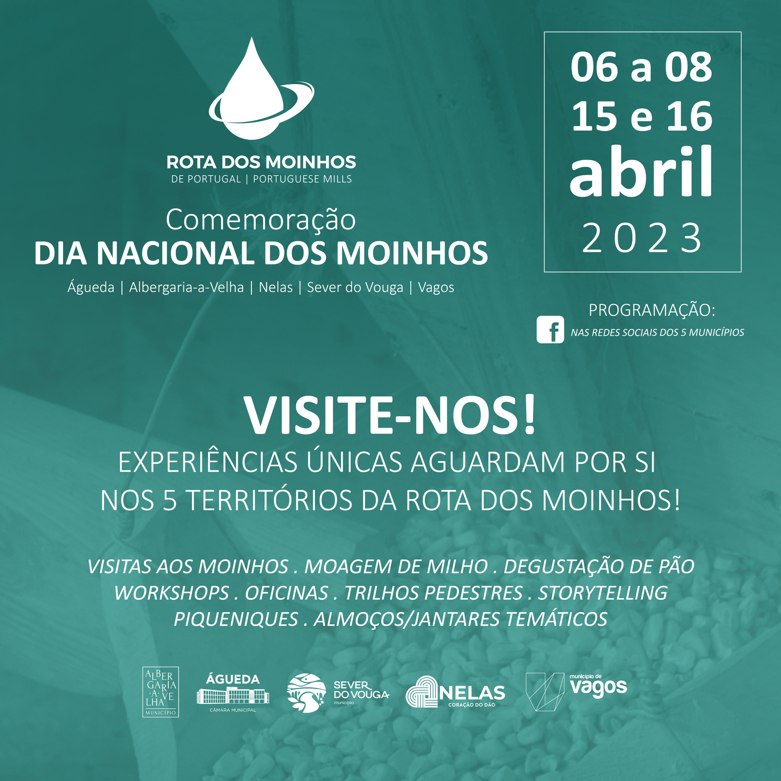 A Rota dos Moinhos de Portugal – Portuguese Mills, constituída pelos municípios de Águeda, Albergaria-a-Velha, Nelas, Sever do Vouga e Vagos e oficialmente constituída no passado dia 09 de janeiro, com a assinatura do protocolo intermunicipal, apresenta pelo terceiro ano consecutivo um programa conjunto e diversificado de atividades entre 6 e 16 de abril, no âmbito das comemorações do Dia Nacional dos Moinhos.