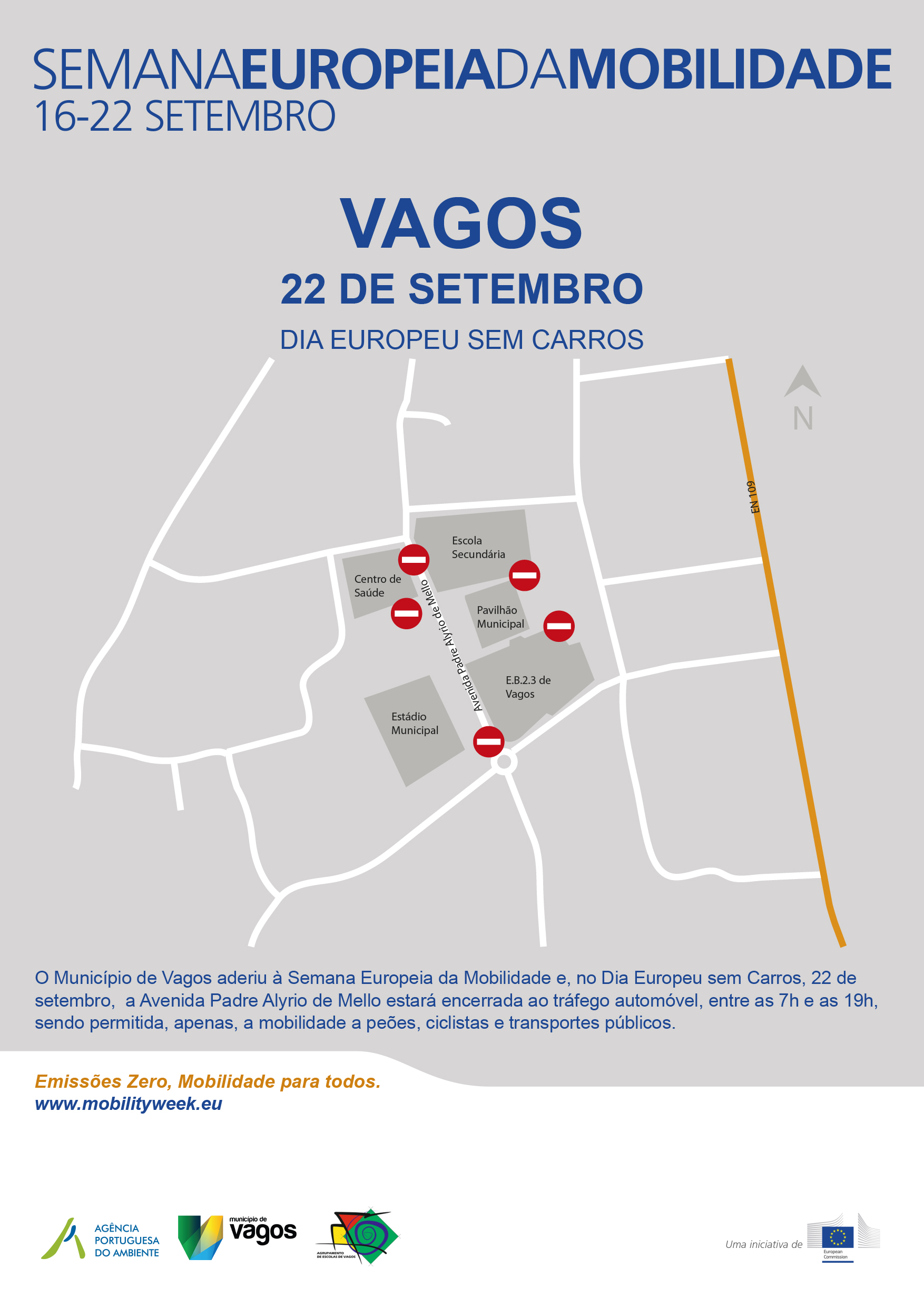 - No Dia Europeu sem Carros, dia 22 de setembro, a Avenida Padre Alyrio de Melo (rua entre a EB 2,3 e Secundária de Vagos) estará encerrada ao tráfego automóvel, entre as 7h e as 19h, sendo permitida, apenas, a mobilidade a peões, ciclistas, veículos prioritários e transportes públicos. Ver mapa