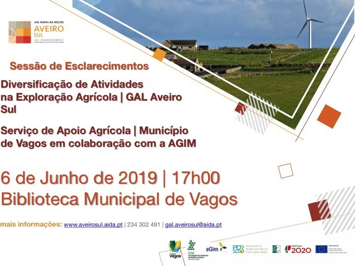 O GAL Aveiro Sul, em parceria com o Município de Vagos, promove uma sessão de esclarecimentos, no próximo dia 6 de junho de 2019, às 17h00, na Biblioteca Municipal de Vagos, relativa à apresentação de candidaturas à tipologia de apoio Diversificação de Atividades na Exploração Agrícola, no âmbito da sua Estratégia de Desenvolvimento Local DLBC/LEADER.