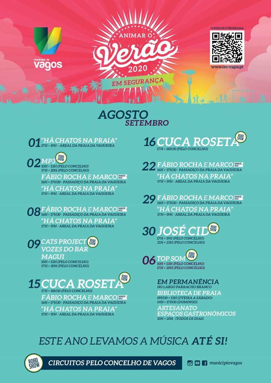 O Município de Vagos apresenta a sua programação de verão 2020, garantindo a animação e sobretudo a segurança de todos os intervenientes. De 26 de julho a 6 de setembro, está garantida muita música e animação, com segurança e em formato roadshow.