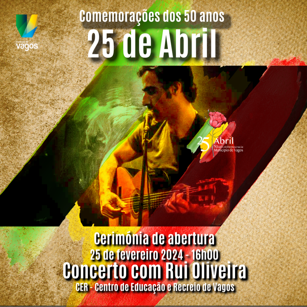 As referidas comemorações vão começar no próximo dia 25 de fevereiro, no Centro de Educação e Recreio de Vagos, às 16h00, com uma cerimónia de abertura, na qual será dado, formalmente, o início deste importante momento para o Município de Vagos, seguida de um concerto com o músico aveirense Rui Oliveira, na interpretação de um repertório de músicas de intervenção.