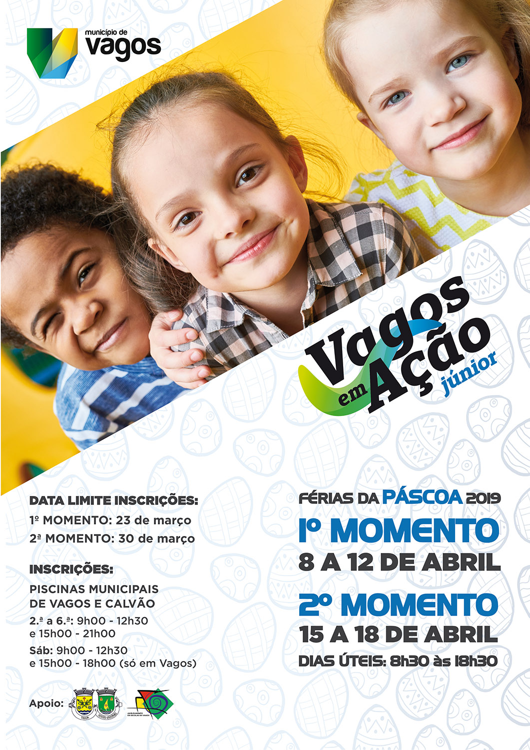 A Câmara Municipal de Vagos, em parceria com o Agrupamento de Escolas de Vagos e a União de Freguesias de Vagos e Santo António, encontra-se a organizar o Programa Municipal Vagos em Ação Júnior - Páscoa 2019 (VEAJ).