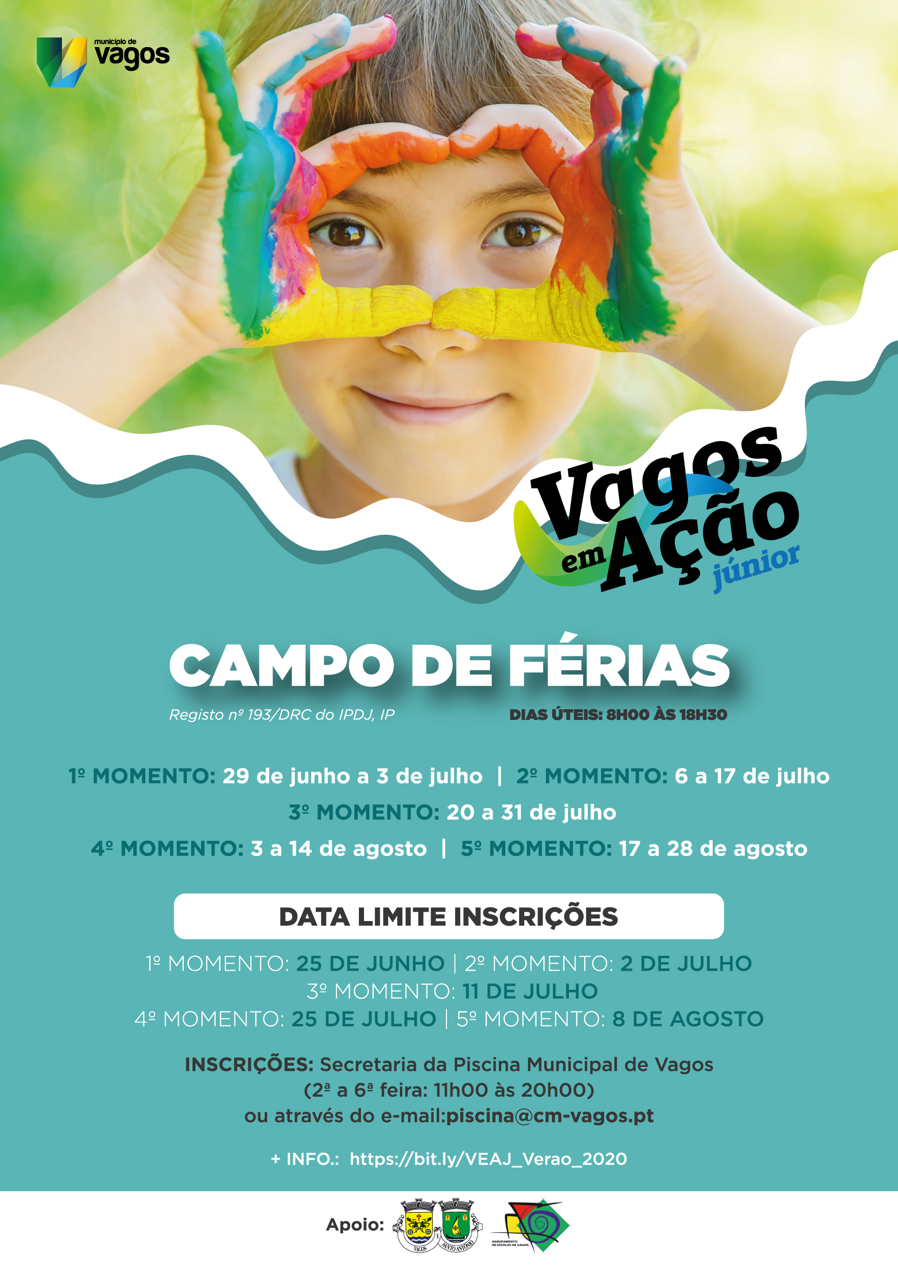 Esta iniciativa, da organização da Câmara Municipal de Vagos em conjunto com o Agrupamento de Escolas de Vagos e a União de Freguesias de Vagos e Santo António, pretende responder à necessidade de ocupação das crianças e dos jovens no período de férias escolares de Verão. O campo de férias destina-se, exclusivamente, a crianças e jovens dos 6 aos 15 anos de idade e funcionará em dias úteis, das 9h30 às 17h30.