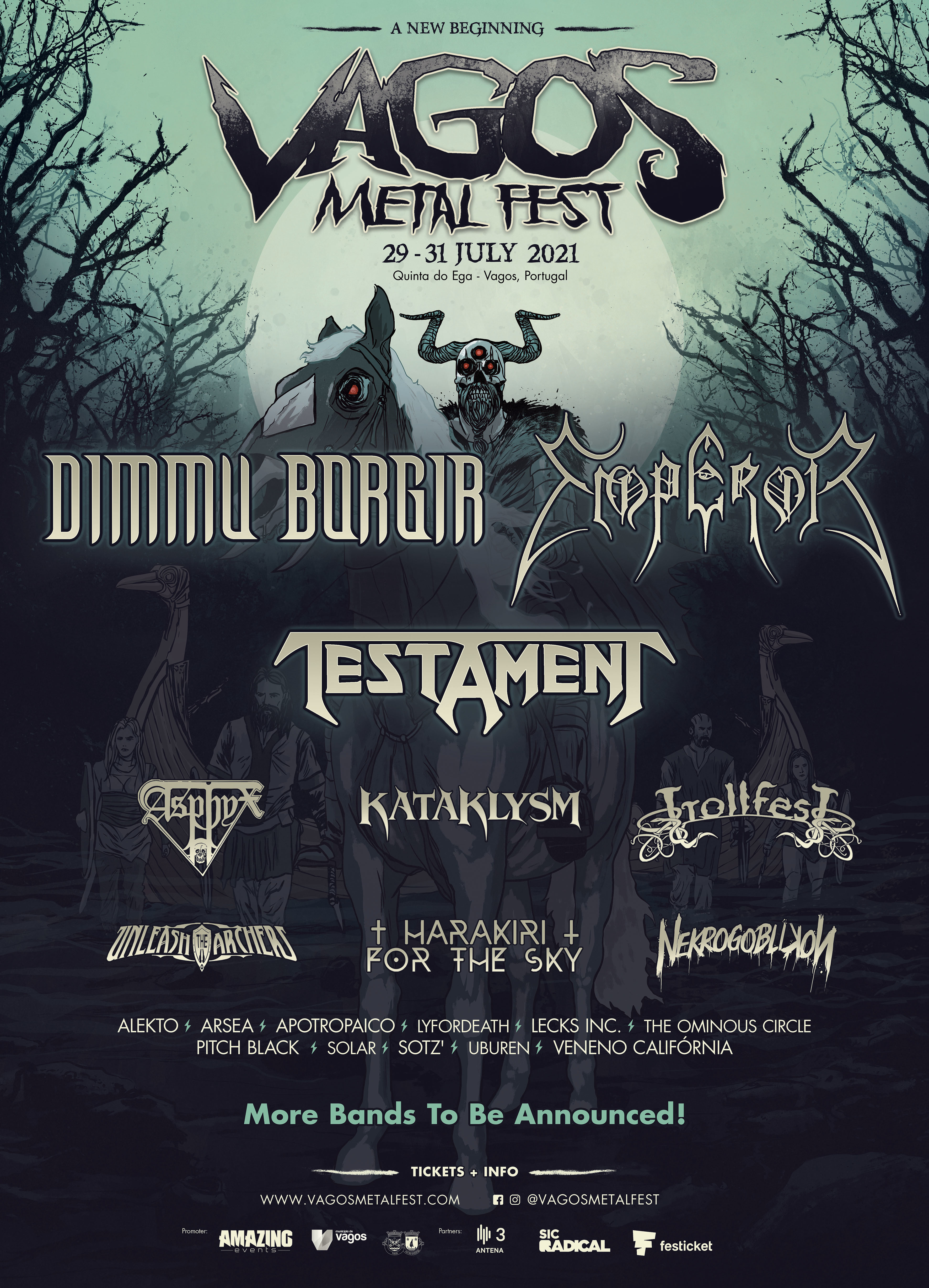 O Vagos Metal Fest 2021 contará também com outra banda precursora do "Norwegian Black Metal" no seu alinhamento: os Emperor, que farão a sua estreia absoluta em solo português. Os "thrashers" norte-americanos Testament completam o lote de cabeças-de-cartaz do festival. A banda liderada por Chuck Billy está de regresso para apresentar o novo álbum "Titans of Creation", editado em Abril deste ano, pela Nuclear Blast Records.