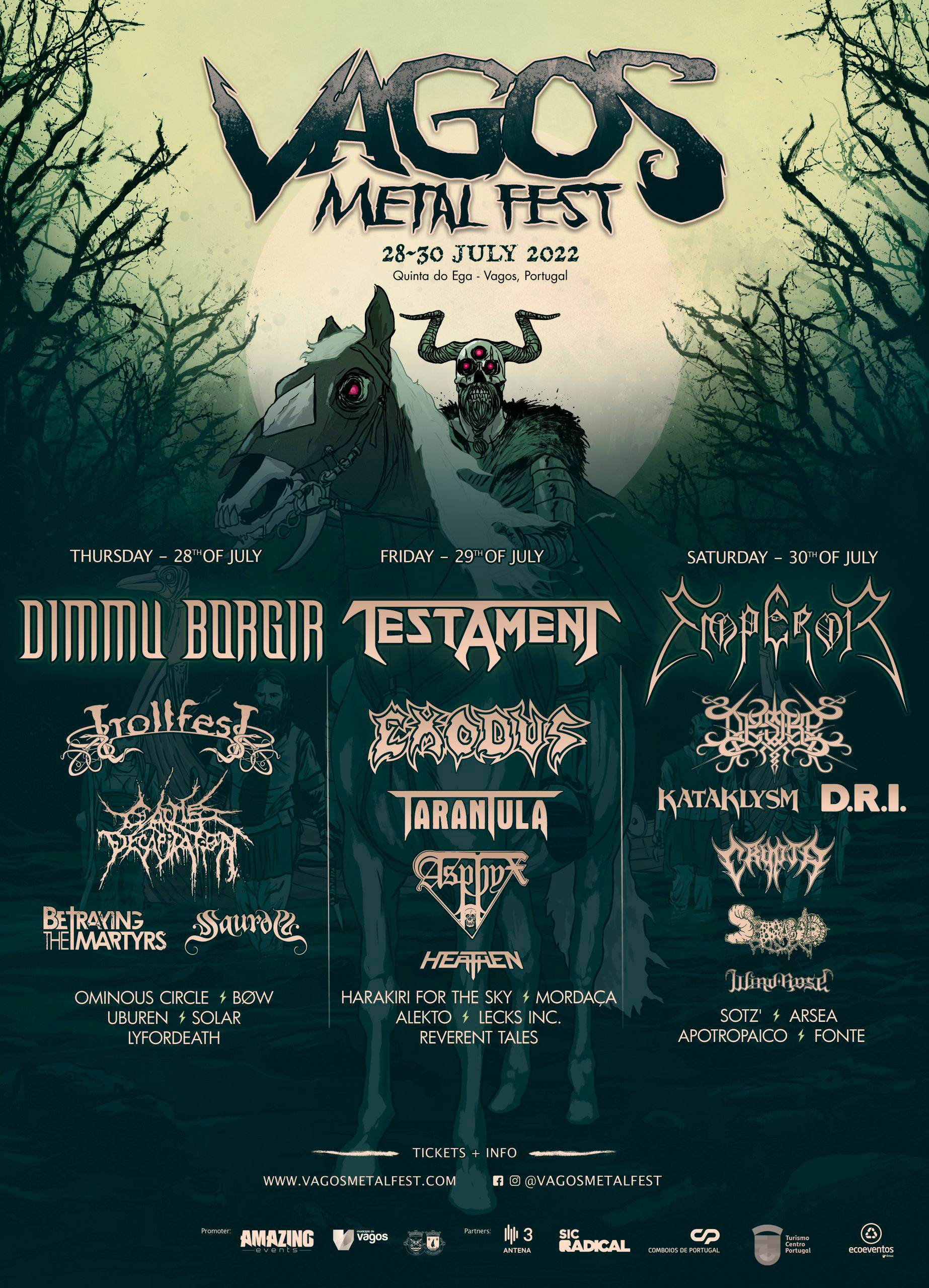 É com prazer que anunciamos os cabeças de cartaz do Vagos Metal Fest - Dimmu Borgir, Testament, Emperor, Trollfest, Exodus que mostraram vontade de atuar para o melhor público do mundo: vocês! (Ver cartaz)