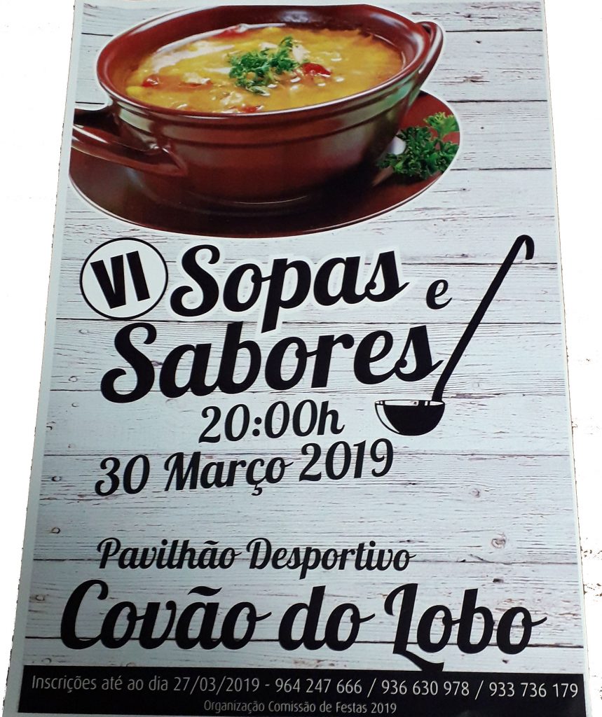 A Comissão de Festas de Covão do Lobo, com a colaboração com a Junta de Freguesia, irá realizar no próximo dia 30 de março, a 6ª Edição das Sopas e Sabores, no Pavilhão Desportivo de Covão do Lobo, pelas 20:00 horas.