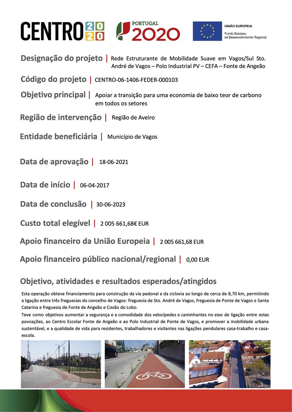 - “Rede Estruturante de Mobilidade Suave em Vagos/Sul Santo André de Vagos Polo Industrial de Ponte de Vagos - CEFA - Fonte de Angeão”.