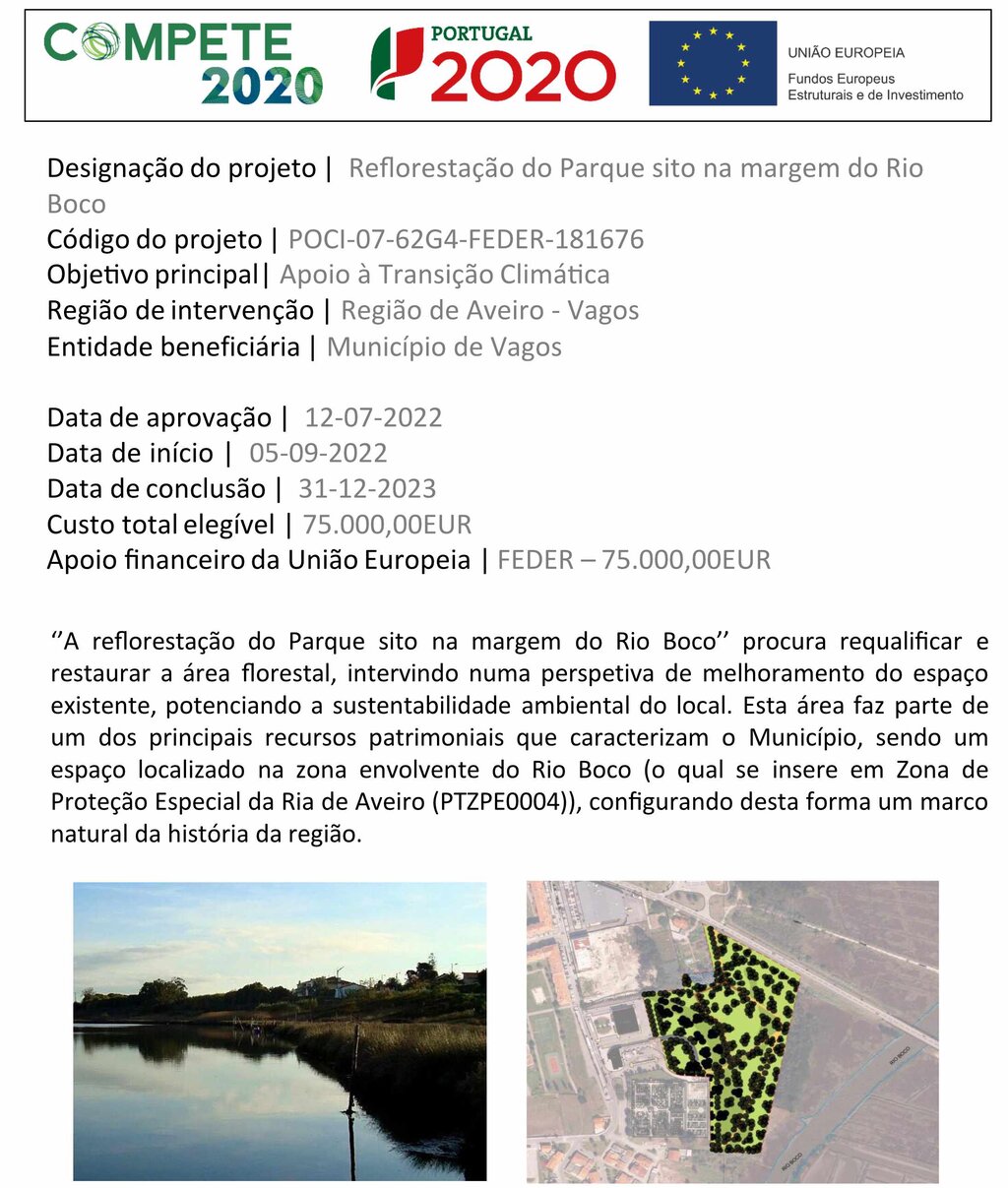 A operação - ’A reflorestação do Parque sito na margem do Rio Boco’’- procura requalificar e restaurar a área florestal, intervindo na perspetiva de melhorar o espaço existente, potenciando a sustentabilidade ambiental do local.