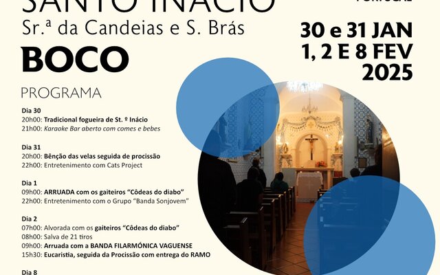 Nos dias 30 e 31 de janeiro e 1, 2 e 8 de fevereiro de 2025 realiza-se a Festa em Honra de St. º Inácio de Antioquia N.ª S.ª das Candeias e São Brás e aqui vai ser possível ...