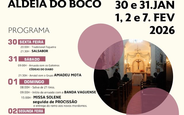 Nos dias 30 e 31 de janeiro e 1, 2 e 7 de fevereiro de 2026, a Aldeia do Boco realiza a Festa em Honra de St. º Inácio de Antioquia, N.ª S.ª das Candeias e São Brás e aqui vai ...
