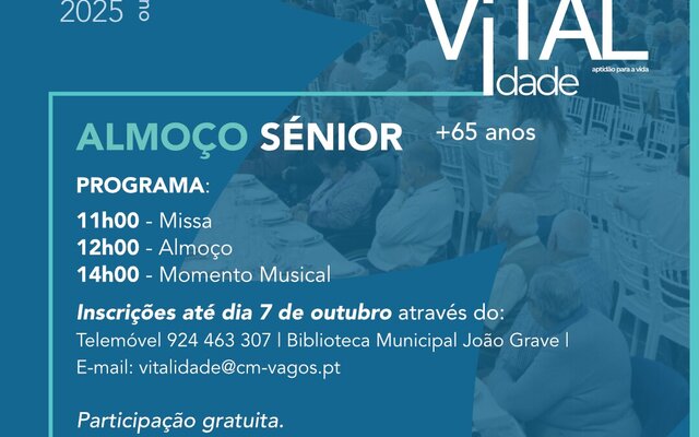O Município de Vagos convida todos os maiores de 65 anos, residentes no concelho de Vagos, a um dia especial de partilha e convívio no Pavilhão Municipal Desportivo de Vagos, ...