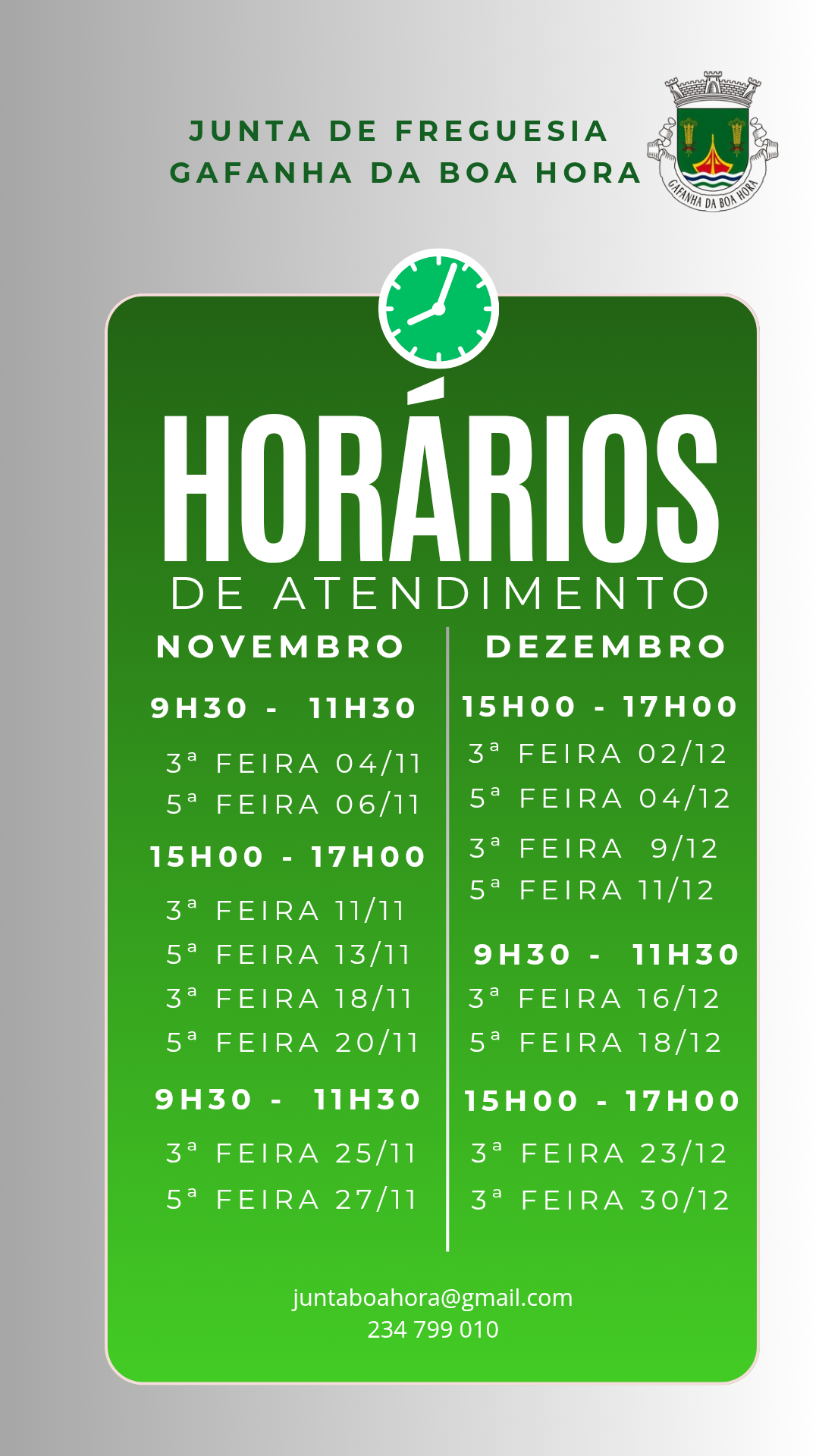 Todos os dia das 9h00 às 12h30 e das 14h00 às 18h00.