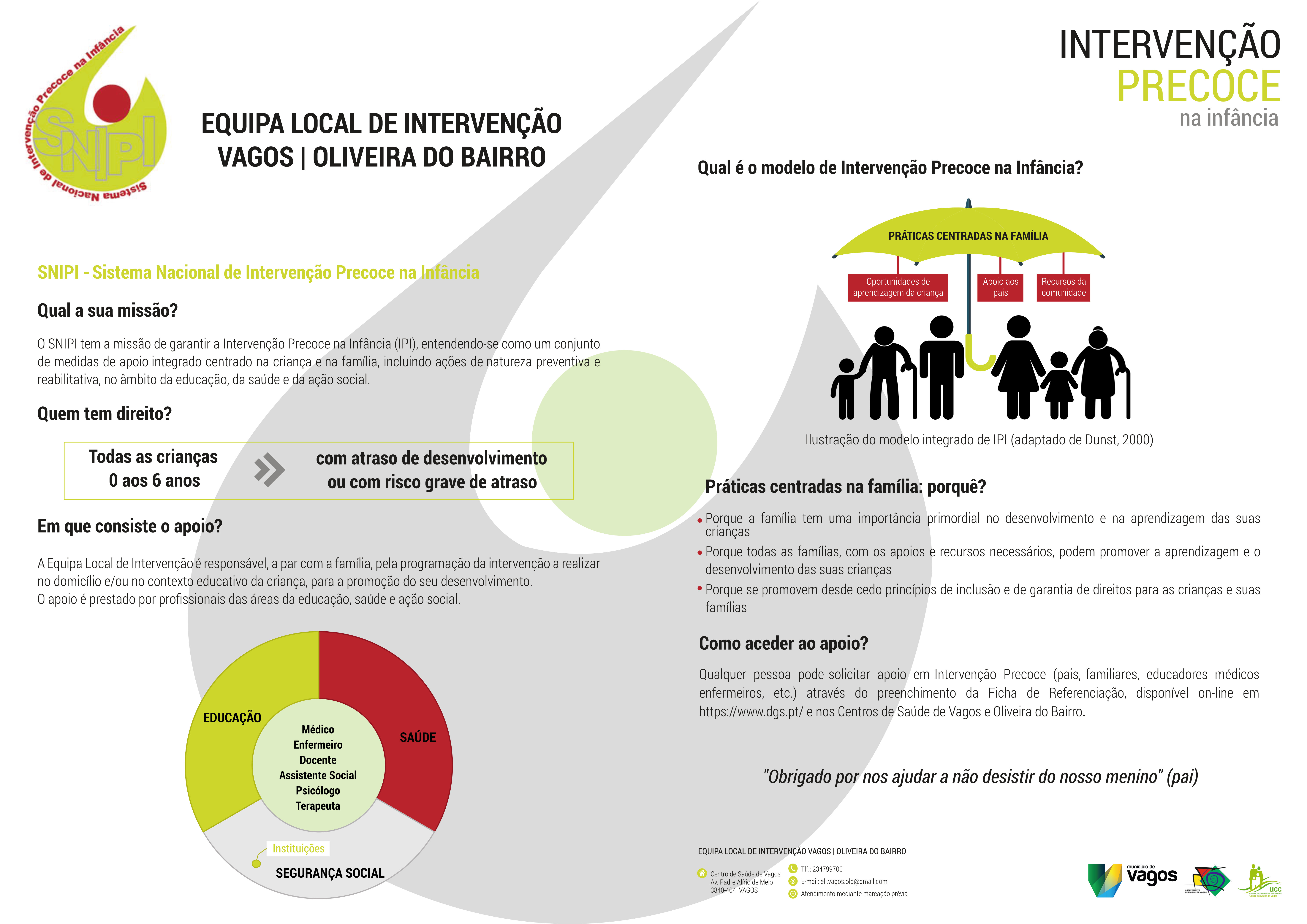 O SNIPI é desenvolvido através da atuação coordenada dos Ministérios do Trabalho e da Solidariedade Social, da Saúde e da Educação. A sede da Equipa Local de Intervenção Precoce situa-se no Centro de Saúde de Vagos. A abrangência territorial da equipa cobre os concelhos de Vagos e Oliveira do Bairro atuando na rede pública pré-escolar, IPSS, amas e domicílio da criança e da família.