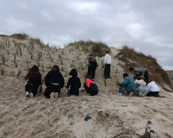 Esta atividade, composta por 2 momentos: uma explicação da saída de campo, com enfoque na necessidade de recuperar o ecossistema dunar e a saída de campo para replantação de estorno (Ammophila arenaria).
