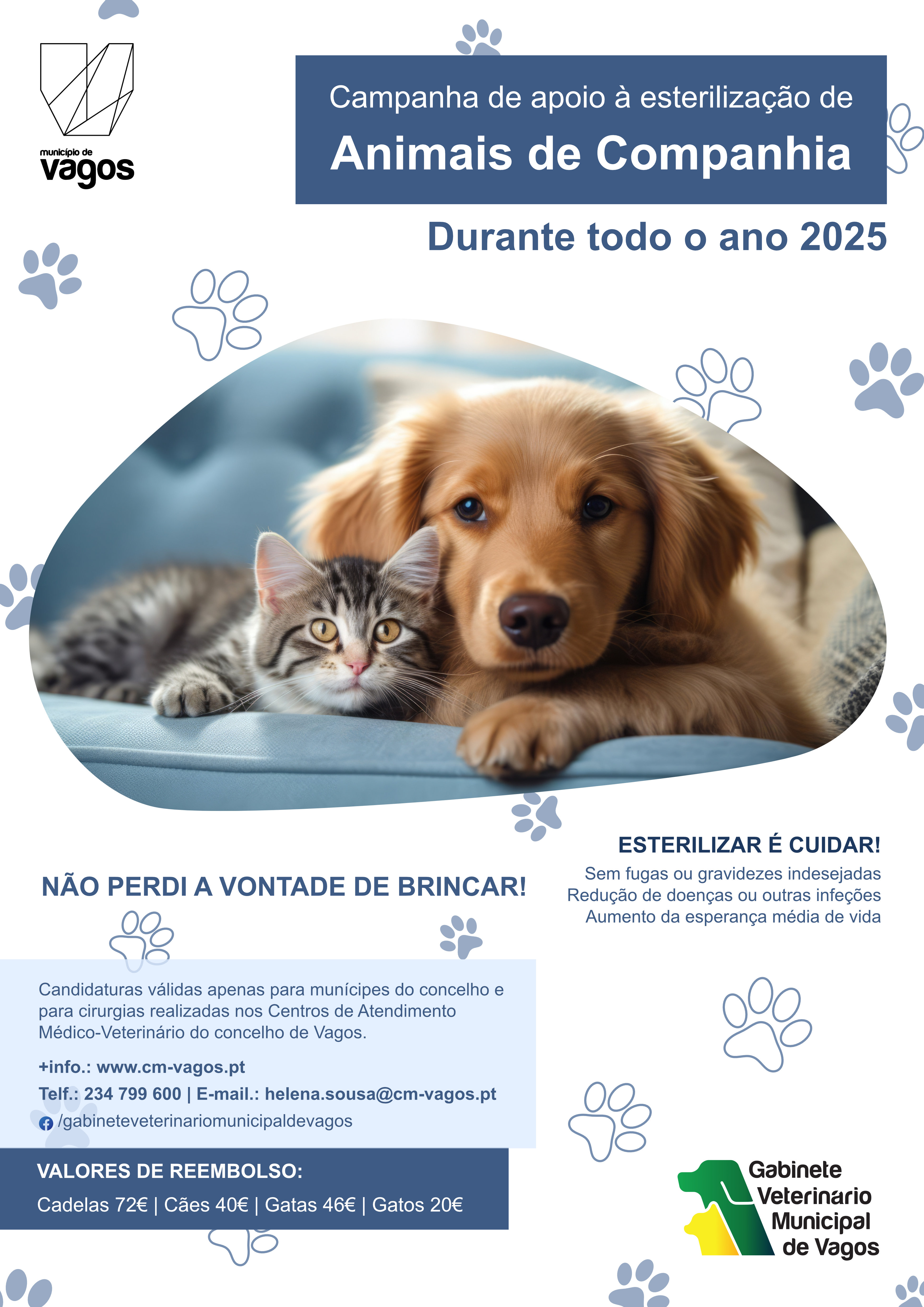 A Câmara Municipal de Vagos aprovou o Programa Extraordinário de Apoio à Esterilização de Animais de Companhia, nomeadamente cães e gatos, dirigido aos munícipes do concelho, a ter lugar durante o ano de 2025.